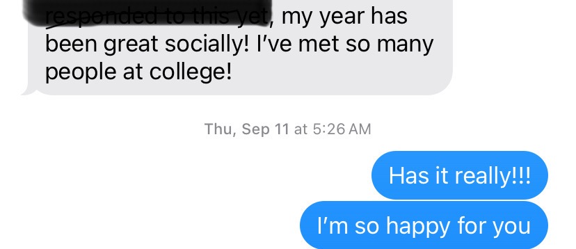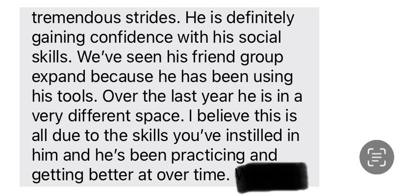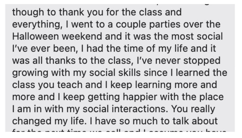 "I wanted to tell you that so far Ben has been thriving in his first week at college. I barely hear from him because he is spending time with new friends. You will appreciate this…He actually told me he saw a girl at one of the organized events, she seemed as socially uncomfortable at the event as he did and he actually went over and started talking. They became fast friends. I do believe that his work with you gave him the confidence to do that 😊"